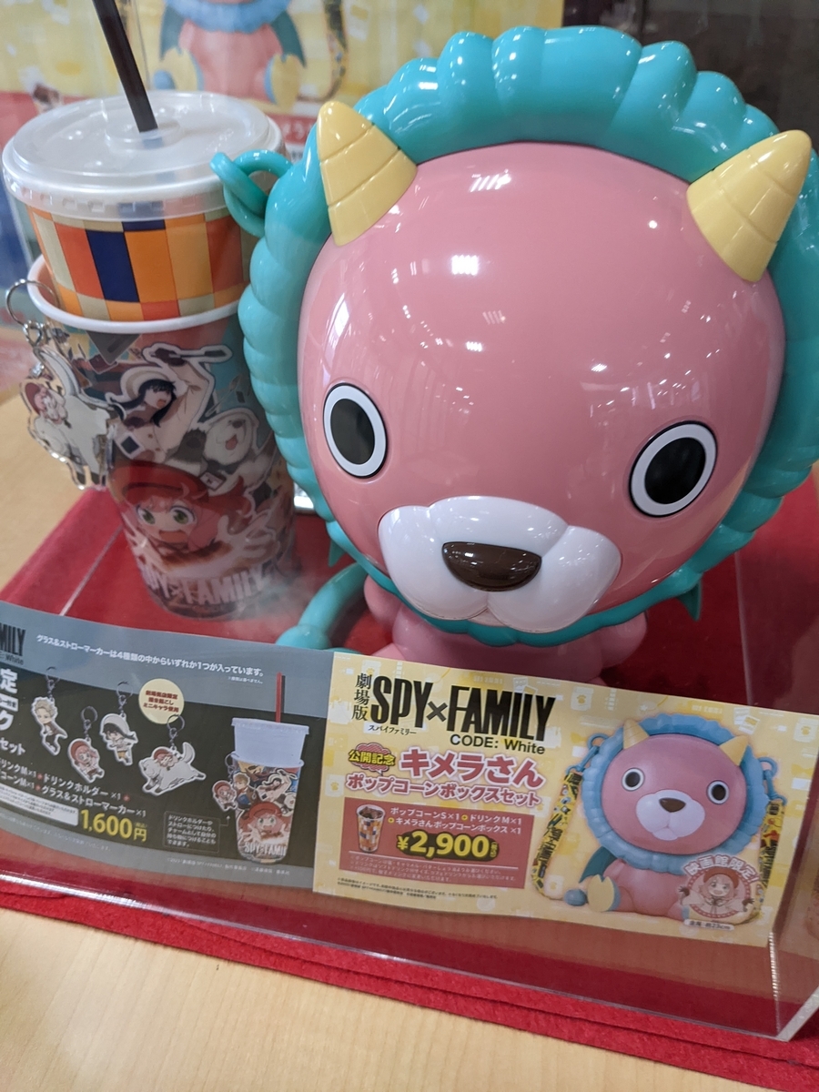 『劇場版 SPY FAMILY CODE:White』「ポップコーンボックスセット」は、『劇場版 SPY×FAMILY CODE: White』の公開記念グッズとして、全国の上映劇場(一部劇場を除く)で販売されているものです。キメラさんのデザインが施されたポップコーンボックスに、ポップコーン5個とドリンク1本が入っています。価格は2,900円です