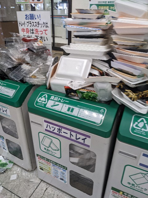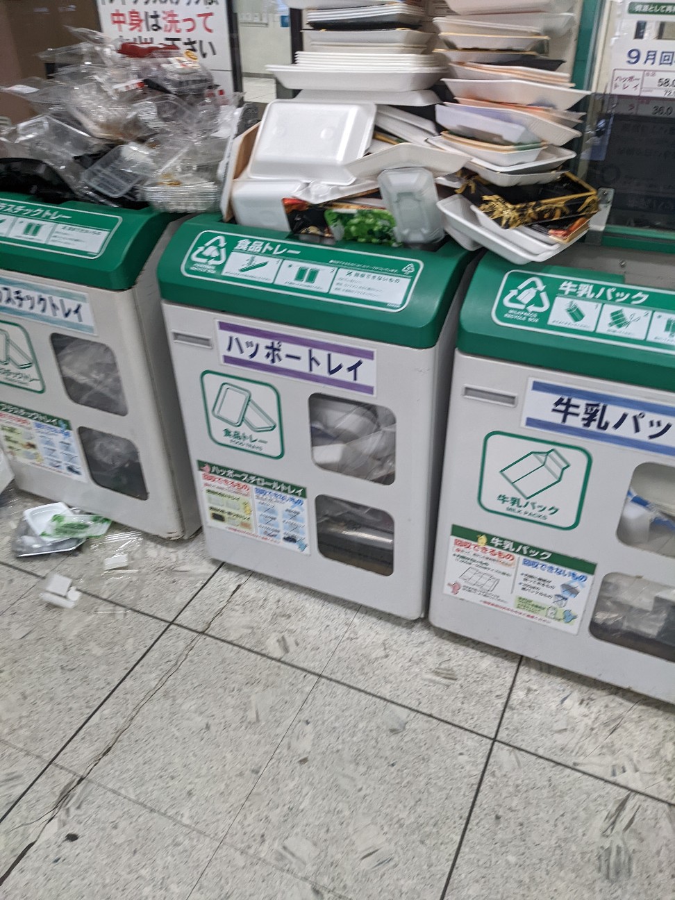 この写真は、緑色のリサイクルボックスの上に山積みになったゴミのリアルな画像です。公共の場所で撮影されたようですが、どこでしょうか?駅やショッピングモールでしょうか?